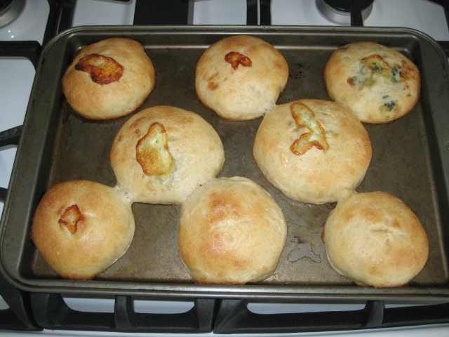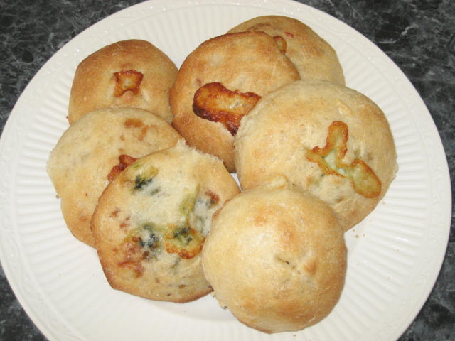 生地作成までホームベーカリーでやって、丸めてチーズやベーコン入れて、醗酵させて、オーブンで焼く。(緑のはほうれん草。カビじゃないよ。笑)