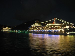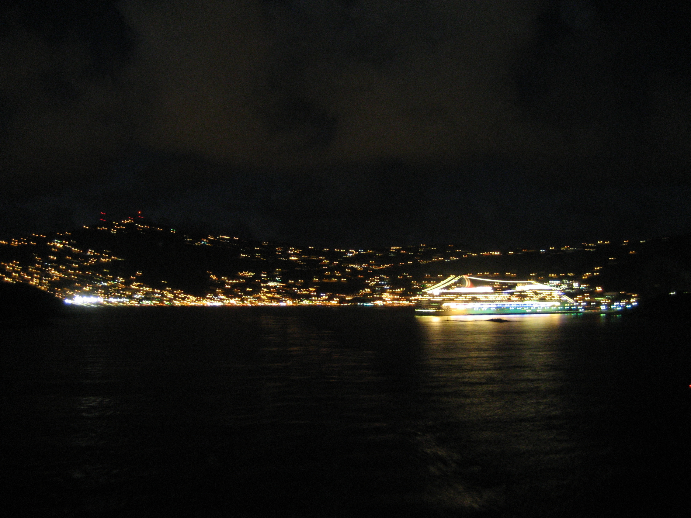 出港の時には辺りは暗くなり、デッキに出ると、島の明かりと他社のクルーズ船のイルミネーションがなんとも美しい。この島は一番先に出港するのがイルミネーションが一番楽しめると思う。
