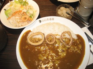 イカリングの付いたサラダからイカリングを拝借して、イカリング付きチーズカレー。美味でした。イカを乗せたり、サラダを食べたりしていたらカレー本体が冷めてしまったのが少々悔やまれます。