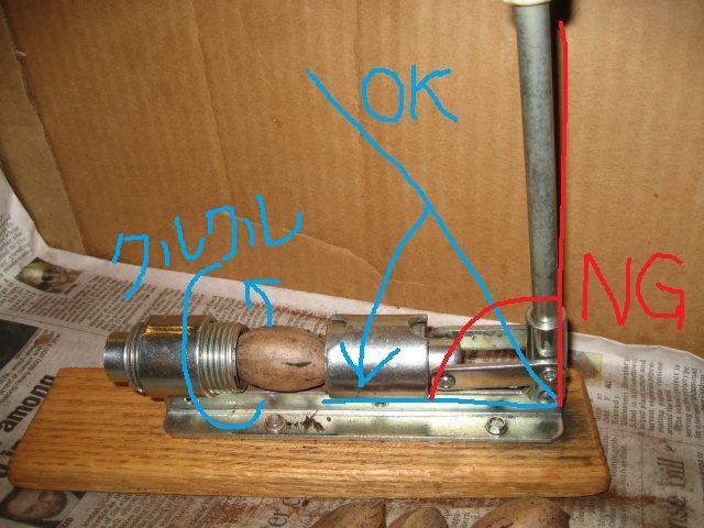 ナッツ1個1個は大きさが微妙に違うので、「割り」の前にナッツ台座を調節。ナッツの大きさに合わせてネジをクルクルクルリと回すと、同時にレバーの角度が変化する。このレバーの角度が大変重要。直角に近いと力が入らない。水平に近いと威力が減少して割れない。