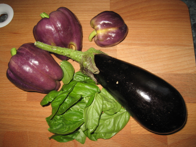 ポツポツとしか実は取れそうにないが、美しく光るナスを収穫し、