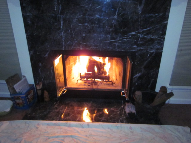 というわけで、火を入れるときは古シーツを持って来て、暖炉前に設置。ビンボーくさいですけどね。(笑)