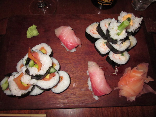 普通のなんでもありレストランなんだけど「巻き寿司が一律5ドルデー」だったので、お寿司をいただいた。