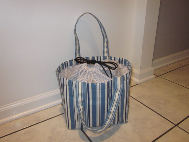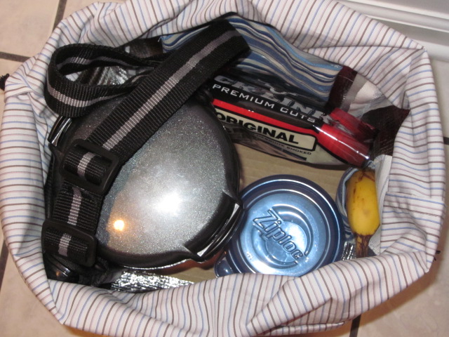 ランチジャー以外にも色々持たせるので、大きめに作ったら大きすぎ。とりあえず底の補強に段ボール。一応ブルーだけど若干キュートがにじみ出ている。