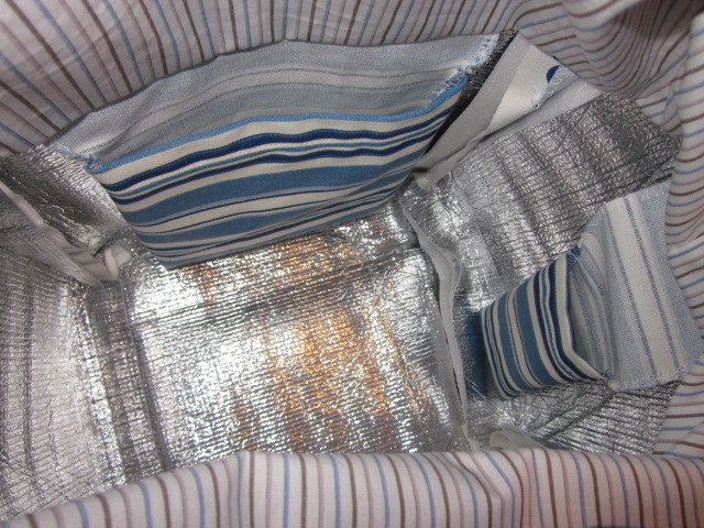 中を見ると、相当てきとう。(縫い代たくさんとらないと破れないか心配でね)でも一応100均で仕入れたアルミシート張りの豪華作品。