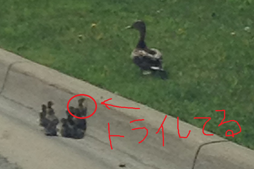 かわいらしいヒナたちは縁石のカベがどうしても超えられないのであった。
