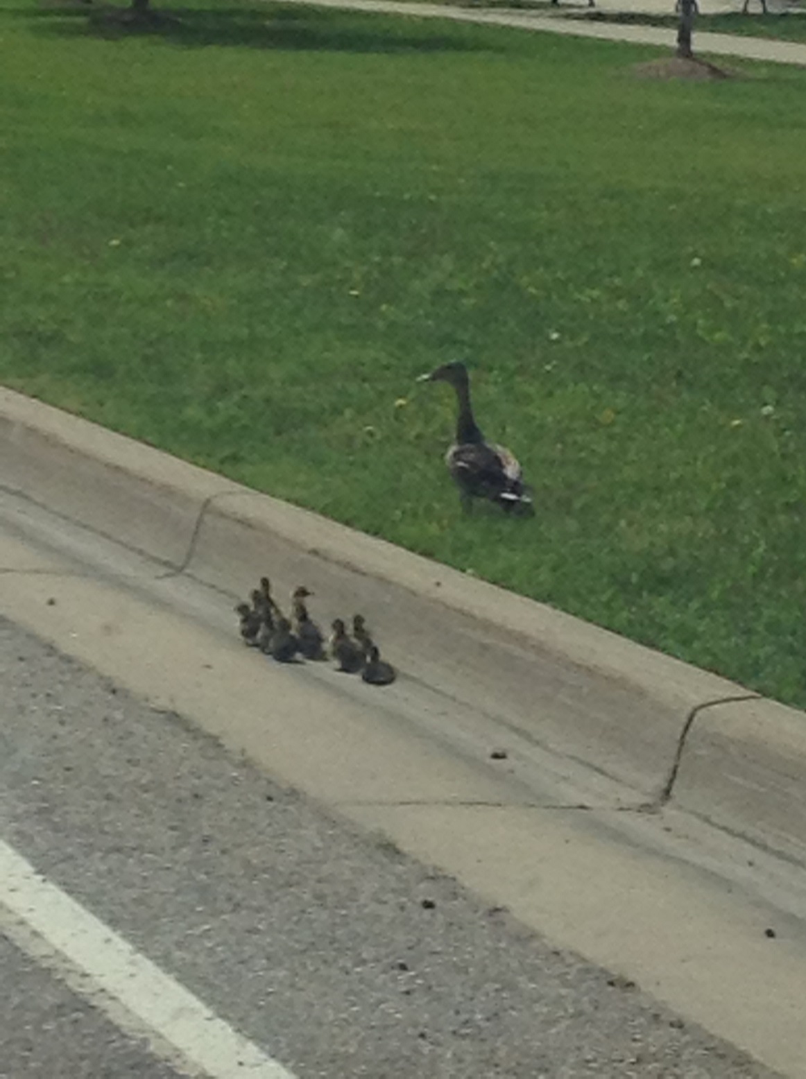すなポンが運転していると、カモの親子が道路を渡っていた。
