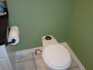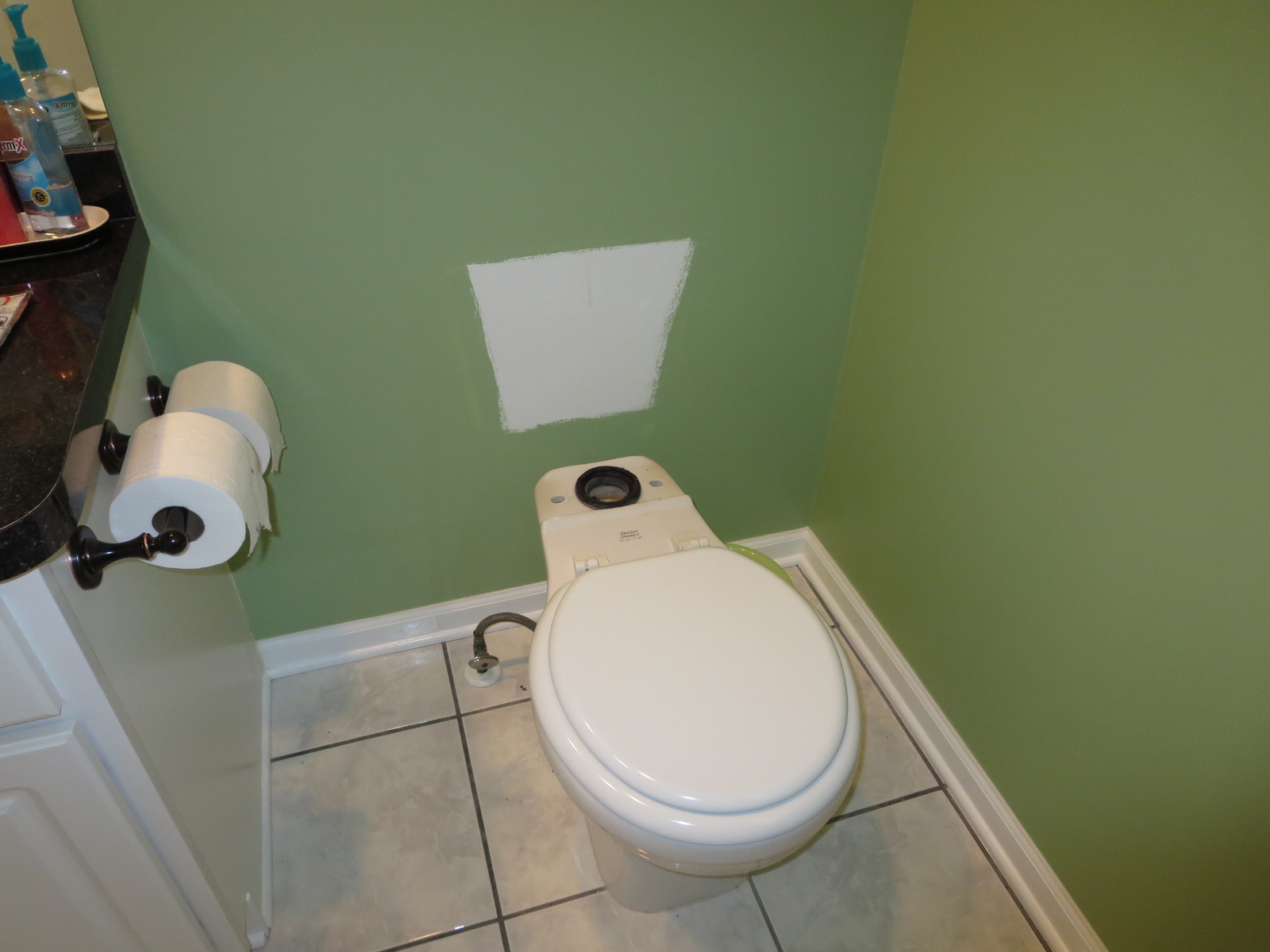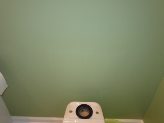 以前、このトイレルームのペンキを塗った時は、当然タンクが邪魔なので裏側はこんな風に残っていました。だいたい家を買ったらトイレは設置済みですから、そこからペンキを塗るってーと、こういうことになるのです。モニークんちもそうでした。
